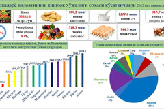 Жумладан, жами сабзавотлар - 518,3 минг тонна, 180,2 минг тонна картошка, мева ва резаворлар - 167,3 минг тонна, озиқбоп полиз экинлари - 183,1 минг тонна, узум - 105,1 минг тонна, сўйиш учун етиштирилган тирик вазндаги қорамоллар ва паррандалар - 315,7 минг тонна, сут - 1277,6 минг тонна, 544,5 млн дона тухум маҳсулотлари етиштирилди.