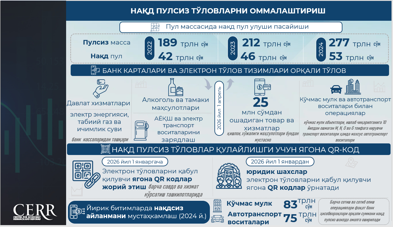 2026 йил 1 январдан эса юридик шахслар банк томонидан шакллантирилган ягона QR-код орқали тўловларни қабул қилишга мажбур бўлади. Бу ягона тўлов инфратузилмасини шакллантириб, электрон тўлов жараёнларини соддалаштиради ва стандартлаштиради.
