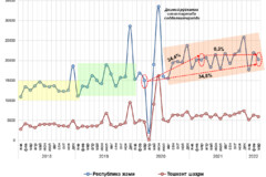 Жорий йил март ойида Ўзбекистонда кўчмас мулк олди-сотди шартномалари сони 20,3 минг донани ташкил этди, бу эса февраль ойига (22 минг) нисбатан 7,6 фоизга камроқдир. 2021 йилнинг мос даврига (20,2 минг) нисбатан ўсиш 0,3 фоизни ташкил этди.