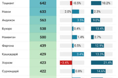 Шунингдек, йиллик ҳисобда фаолликнинг пасайиши Навоий, Наманган ва Тошкент вилоятларида кескинроқ қайд этилиб, кўчмас мулк бозорида битимлар сони мазкур ҳудудларда 30 фоиздан юқорироқ камайган.