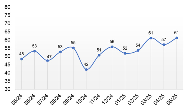 Қурилиш тармоғида бизнес муҳити май ойида барқарор ҳолатда сақланиб, 57 бандни ташкил этди — бу кўрсаткич ўтган йилнинг май ойидаги натижага мос келади.