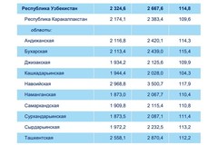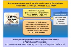 2020 йилда республика бўйича ўртача ойлик иш ҳақи 2,66 млн сўмни ташкил этиб, 2019 йилга нисбатан 14,8 фоизга ўсди. Ўзбекистон бўйича энг юқори иш ҳақи Тошкент шаҳри (3,99 млн сўм), ҳамда Навоий (3,5 млн) ва Тошкент (2,87 млн сўм) вилоятларида қайт этилган.