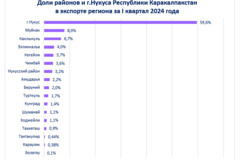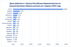 Таҳлиллар шуни кўрсатдики, 2024 йил I чорагида ҳудуд ташқи савдо айланмасининг 56,5 фоизи Нукус шаҳри ҳиссасига тўғри келган. Ташқи савдо айланмасида энг катта улуш билан кейинги ўринларни Мўйноқ (7,5%), Тўрткўл (5,9%), Қонликўл (4,7%), Қўнғирот (4,1%), Элликқалъа (3,6%) туманлари эгаллаган. Тахтакўпир (0,6%), Қораўзак (0,3%) ва Бўзатов (0,1%) туманларининг улуши эса сезиларли даражада паст бўлган.