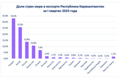 2024 йилнинг I чорагида Қорақалпоғистон Республикаси Туркия (23,2%), Хитой (21,1%), Россия (17,3%), Қозоғистон (10,3%), Литва (4,9%) ва Латвия (4,6%) билан кўпроқ савдо қилган.