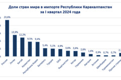 Таҳлил қилинаётган давр мобайнида Қорақалпоғистон Республикасига энг кўп товар ва хизматлар Россия (23,6%), Литва (13,9%), Хитой (12,2%), Қозоғистон (9,5%) ва Корея Республикасидан (9,4%) импорт қилинган.