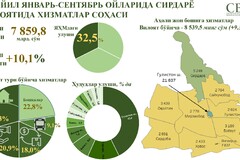 2024 йил январь-сентябрь ойларида хизматлар соҳаси таркибида энг катта улуш яшаш ва овқатланиш (29,3%), савдо (20,9%), молиявий (18,0%) ва транспорт (9,1%) хизматларига тўғри келган. Кейинги ўринларни бошқа хизматлар (6,0%), алоқа ва ахборотлаштириш хизматлари (4,2%) ҳамда таълим (2,6%) хизматлари эгаллаган.