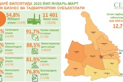 2023 йил январь-март ойлари давомида ялпи ҳудудий маҳсулотнинг (ЯҲМ) 54,8% (2022 йил январ-мартида 56,8%) кичик бизнес субъектлари томонидан ишлаб чиқарилди.