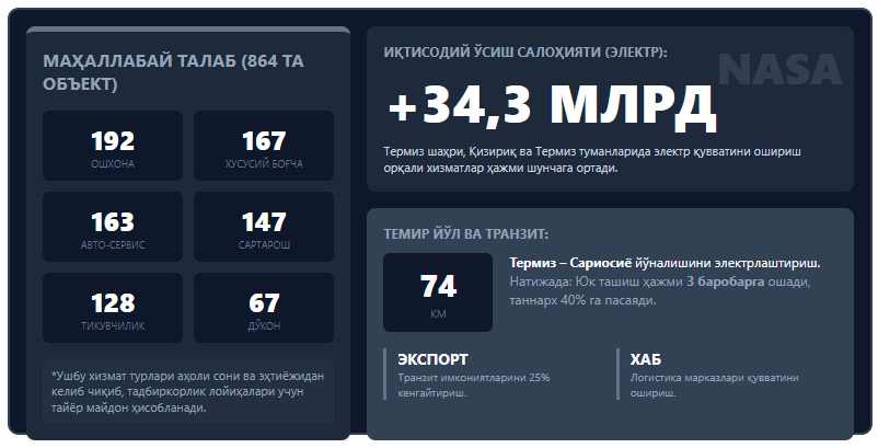 Хизматлар соҳасида ўтказилган сўров натижаларига кўра, 69 та маҳаллада озиқ-овқат дўкони, 128 та маҳаллада кийим тикиш, 192 та маҳаллада умумий овқатланиш, 147 та маҳаллада сартарошхона, 163 та маҳаллада авто-тех хизмат ва 167 та маҳаллада хусусий мактабгача таълим объектларини очиш имконияти мавжуд. NASA сунъий йўлдош маълумотлари таҳлилига кўра, Термиз шаҳри (28,4 млрд сўм), Қизириқ тумани (4,7 млрд сўм) ва Термиз туманида (0,8 млрд сўм) электр истеъмолини ошириш орқали хизматлар ҳажмини қўшимча 34,3 млрд сўмга ошириш мумкин.