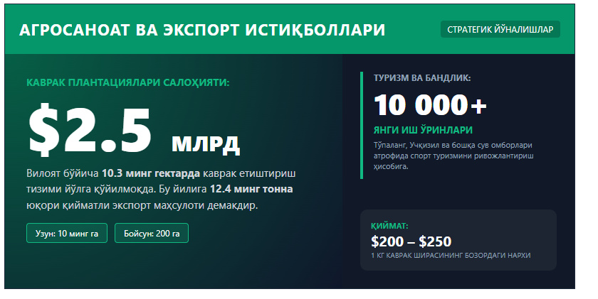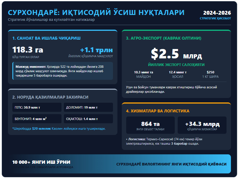 Таҳлиллар Сурхондарё вилоятида саноат, тоғ-кон, қишлоқ хўжалиги, туризм ва хизматлар соҳаларида катта қўшимча захира ва иқтисодий имкониятлар мавжудлигини кўрсатди.