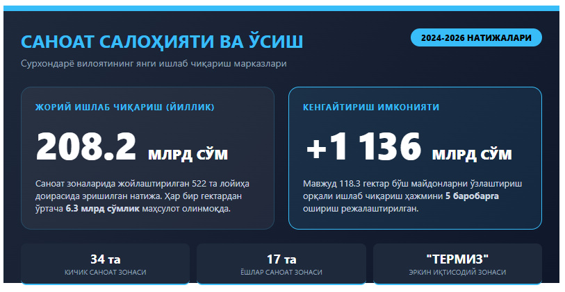 Вилоятда 34 та кичик саноат зонаси, 17 та ёшлар саноат ва тадбиркорлик зоналари ҳамда “Термиз” эркин иқтисодий зонасида жами 151,4 гектар ер майдони мавжуд. Шундан 92,2 гектарига 522 та лойиҳа жойлаштирилган. Ҳозирда ер майдонларининг 21,9 фоизидан (33,1 гектар, 249 лойиҳа) тўлиқ фойдаланилмоқда. 2024 йилда ушбу ҳудудларда 208,2 млрд сўмлик маҳсулот ишлаб чиқарилган. Бир гектарга ўртача ишлаб чиқариш ҳажми 6,3 млрд сўмни ташкил этган. Таҳлилларга кўра, бўш турган 118,3 гектар майдондан самарали фойдаланиш орқали йилига қўшимча 1 136 млрд сўмлик саноат маҳсулоти ишлаб чиқариш имконияти мавжуд.