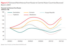Европа ва Марказий Осиё мамлакатларига пул ўтказмалари ҳажми 2020 йилда 8,6 фоизга камайган бўлса, Европа иттифоқидаги иқтисодий тикланиш ҳамда нефть ва газ нархларининг кескин ошиши ҳисобига 2021 йилда унинг ҳажми 5,3 фоизга ўсиб, 67 миллиард долларни ташкил этиши кутилмоқда. 2022 йилда пул ўтказмалари ҳажми 3,8 фоизга ўсиши кутилмоқда.