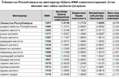 | Ўзбекистон Республикаси | ↑1291 | ↑1.0136 | ↑1.7172 | ↑1.0265 | ↓0.7789 |