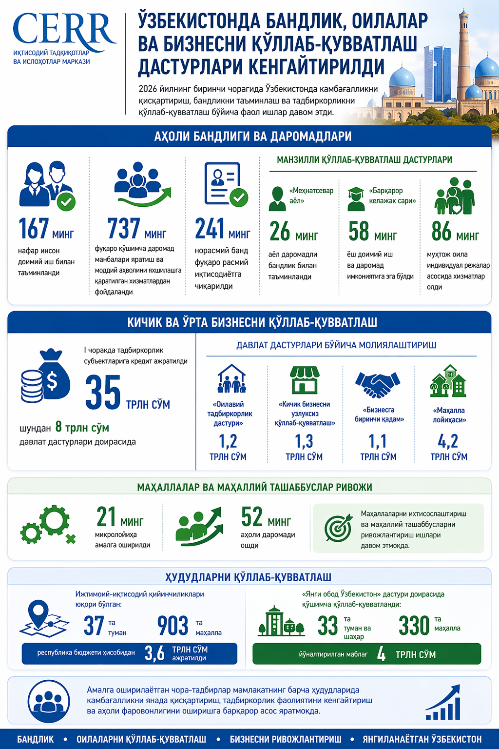 Шунингдек, 86 мингта камбағал оила билан манзилли иш олиб борилиб, “индивидуал режалар” асосида 105 мингта хизматлар кўрсатилди. Бу орқали ушбу оилаларнинг барқарор даромад манбалари шакллантирилмоқда.