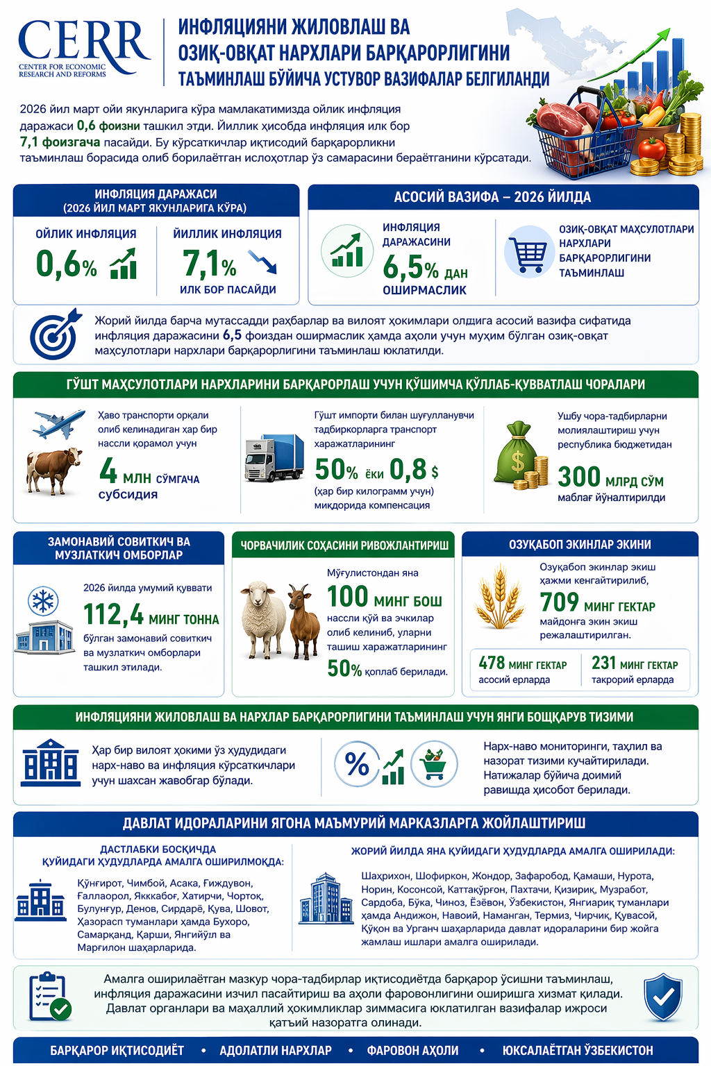 Жорий йилда барча мутассадди раҳбарлар ва вилоят ҳокимлари олдига асосий вазифа сифатида инфляция даражасини 6,5 фоиздан оширмаслик ҳамда аҳоли учун муҳим бўлган озиқ-овқат маҳсулотлари нархлари барқарорлигини таъминлаш юклатилди. Ушбу мақсадларга эришиш учун иқтисодий сиёсатнинг янги ёндашувлари жорий этилмоқда.