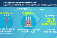 - В 5377 махаллях будут проложены 15000 км линий электропередачи, модернизированы более 4000 трансформаторов. На это было выделено 2,1 трлн. сумов.