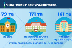 - В рамках программы «Обод кишлок» будут проведены строительные и ремонтные работы в 79 школах, 171 дошкольных образовательных учреждениях, 161 медицинском учреждении.