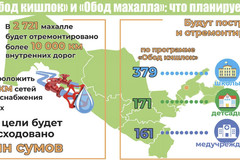 В рамках программ «Обод кишлок» и «Обод махалла» утверждены параметры, предусматривающие осуществление работ по строительству, ремонту и благоустройству общей стоимостью 20,8 трлн сумов в 7 794 селах и махаллях всех районов и городов.