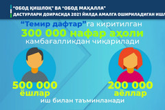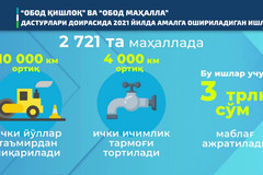 Примечательно, что в 2021 году, который будет ознаменован выходом из тяжелого кризиса, на реализацию программ «Обод кишлок» и «Обод махалла» впервые будут выделены средства без внешних заимствований. Эти средства будут направлены на целевые программы по социальной сфере, питьевому водоснабжению, автодорогам и объектам инфраструктуры в разрезе каждой махалли.