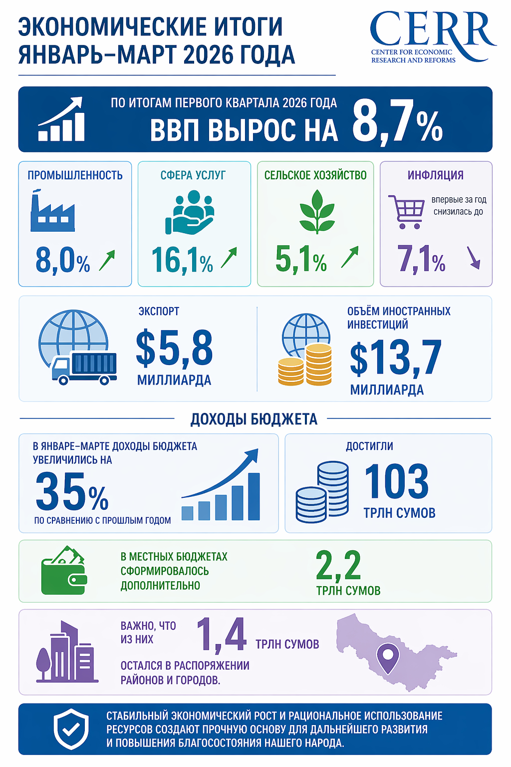Благодаря этим результатам доходы бюджета в январе–марте увеличились на 35% по сравнению с аналогичным периодом прошлого года и достигли 103 трлн сумов. В местных бюджетах дополнительно сформировано 2 трлн 200 млрд сумов средств. Важно, что из этой суммы 1 трлн 400 млрд сумов осталось в распоряжении районов и городов.