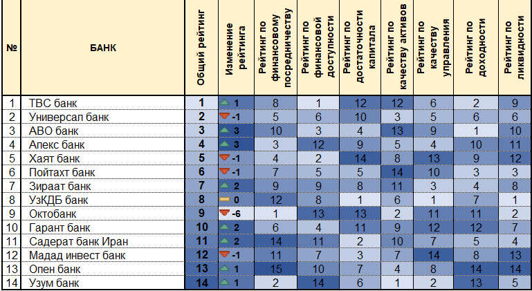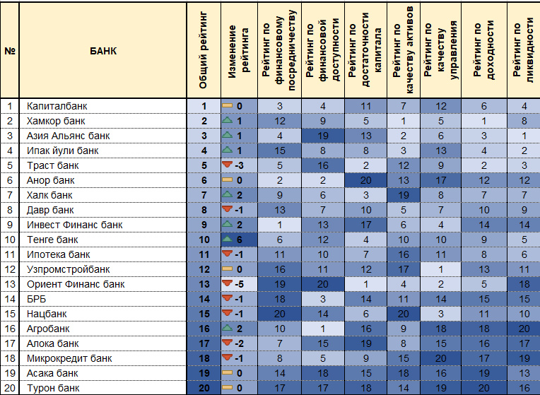 Наиболее заметный прогресс показал «Тенге банк», поднявшийся на 6 позиций, еще 3 банка («Агробанк», «Инвест финанс банк», «Халк банк») поднялись на 2 позиции. Позитивную динамику также продемонстрировали «Ипак йули банк», «Азия Альянс банк» и «Хамкорбанк», улучшив свои позиции в общем рейтинге.