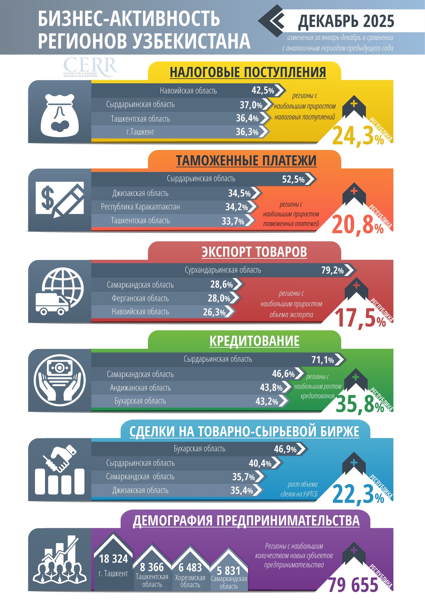 Центр экономических исследований и реформ представил мониторинг деловой активности регионов Республики Узбекистана за 2025 год.