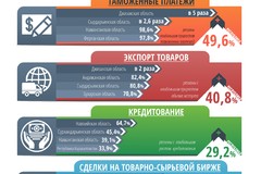 По данным ГТК объем экспорта товаров с начала года увеличился на 40,8% по сравнению с аналогичном периодом прошлого года. Рост объемов экспорта товаров обеспечен в Джизакской (в 2 раза), Андижанской (на 82,4%), Сырдарьинской (на 80,8%), Бухарской (на 70,8%) и Ташкентской (61,2%) областях.
