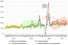 В разрезе регионов рост по сравнению с маем наблюдался во всех областях республики. Наибольшие темпы роста наблюдались в Самаркандской (31,7%), Ферганской (27,1%), Наманганской (26,2%), Джизакской (25,7%) и Навоийской (22,6%) областях.