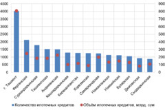 В разрезе регионов наибольшее количество ипотечных кредитов приходилось на г. Ташкент (4012, а объём – 809,4 млрд. сум ), Ферганскую (2122, а объём – 248,1 млрд. сум), Сурхандарьинскую (1782, а объём – 185,1 млрд. сум), Ташкентскую (1524, а объём – 185,1 млрд. сум) и Андижанскую (1508, а объём – 226,7 млрд. сум) области.