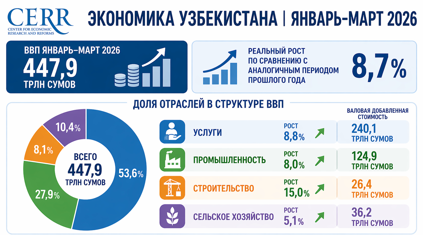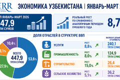 По итогам I квартала 2026 года экономика Узбекистана продемонстрировала уверенный рост и устойчивость по ключевым направлениям. Объем ВВП в текущих ценах составил 447,9 трлн сумов, или $36,9 млрд. Реальный рост экономики достиг 8,7%, что на 1,9 п.п. выше показателя аналогичного периода прошлого года и превышает ранее ожидаемые ориентиры. Это лучший квартальный результат за последний год.