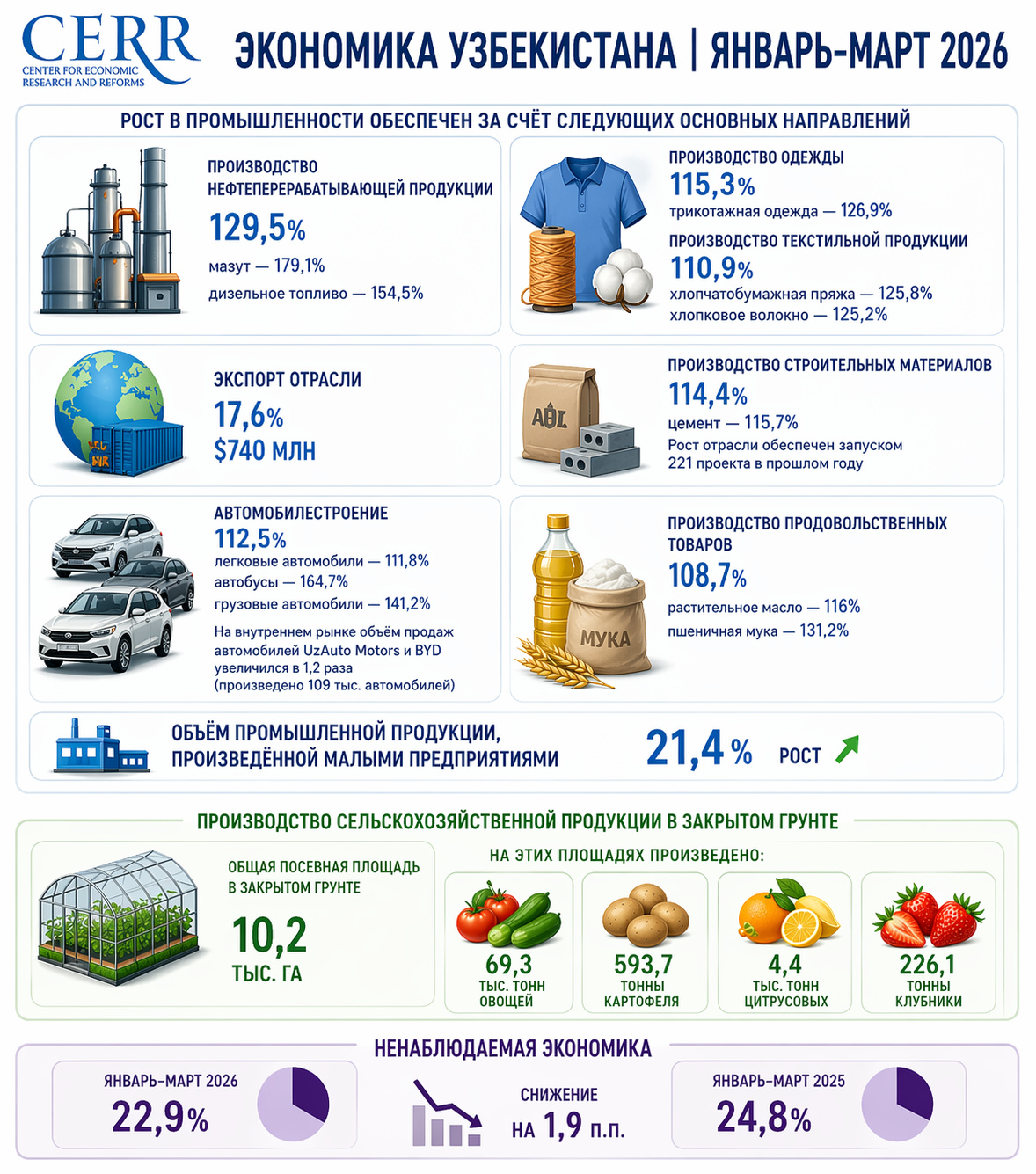 Высокие результаты показала легкая промышленность: производство одежды и текстиля выросло на 15,3%, трикотажной продукции — на 26,9%, хлопкового волокна — на 25,2%. Производство строительных материалов увеличилось на 14,4%, цемента — на 15,7%. В автомобилестроении выпуск вырос на 12,5%, включая автобусы — на 64,7% и грузовые автомобили — на 46,6%. В пищевой промышленности рост составил 8,7%, в том числе по растительному маслу — 16,0% и муке — 31,2%.