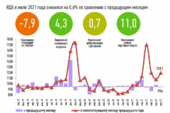 Индекс деловой активности в июле 2021 года умеренно снизился на 0,6% и составил 994 пунктов, по сравнению с предыдущим месяцем, что объясняется изменениями нижеследующих компонентов:
