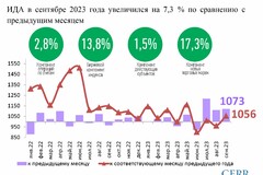 Индекс деловой активности в сентябре 2023 года увеличился на 7,3% по сравнению с предыдущим месяцем и составил 1073 пунктов, что объясняется изменениями нижеследующих компонентов: