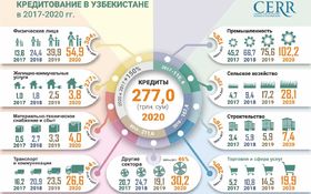 Реальный рост кредитов в среднем составлял 38,6% в год. По состоянию на 1 января 2021 года общий объем кредитов, выданных экономике, составил 277 трлн сумов и увеличился на 150% по сравнению с 2017 годом.