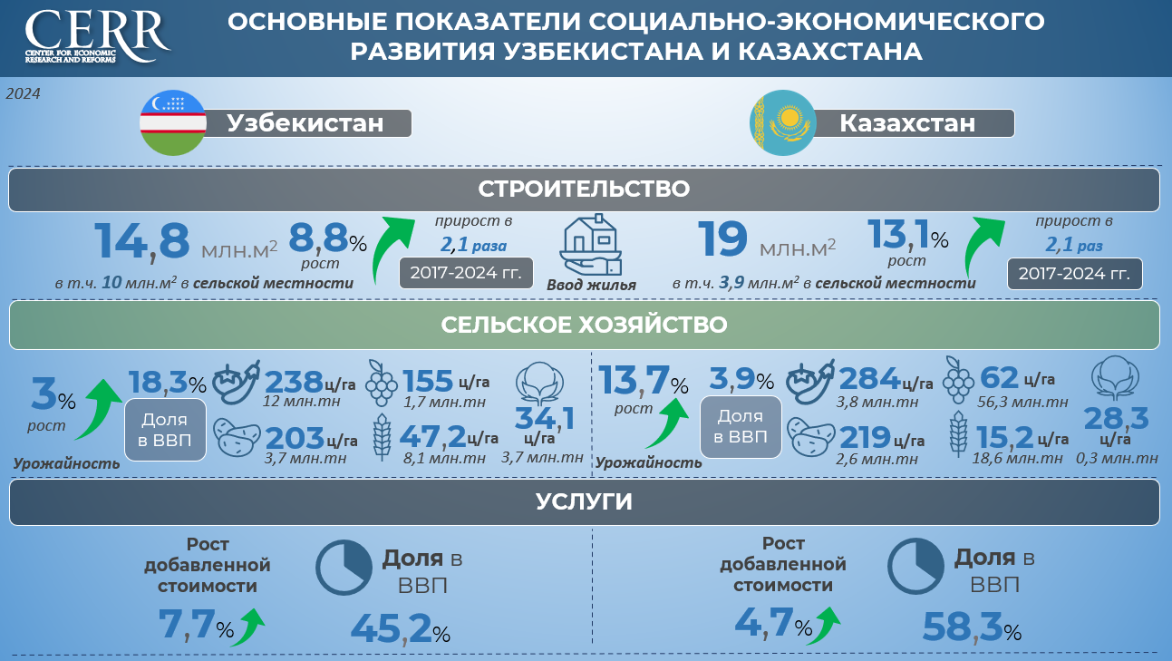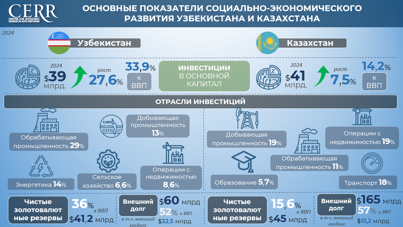 Узбекистан и Казахстан последовательно модернизируют свои экономики, наращивают инвестиции в промышленность, инфраструктуру и человеческий капитал. При этом усиливается внимание развитию регионов, сельского хозяйства и сферы услуг, что способствует повышению качества жизни населения и созданию прочной основы для долгосрочного устойчивого развития стран.