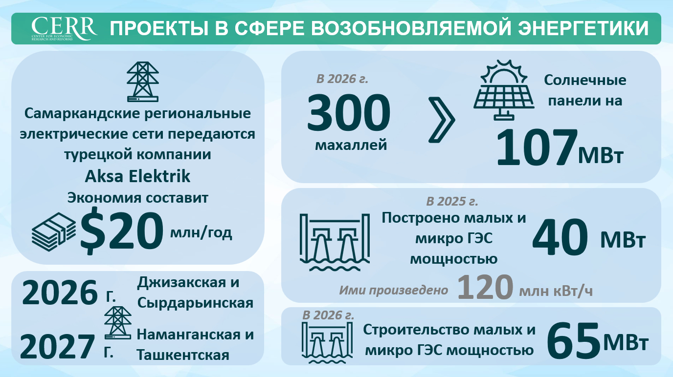 Важнейшим направлением остается поддержка населения в переходе к альтернативным источникам энергии. На основе китайской модели кооперации в 300 махаллях уже в следующем году будут установлены солнечные станции общей мощностью 107 МВт. Этот подход позволит обеспечить «зеленой» энергией 30 тыс. малообеспеченных семей, которые получат возможность продавать излишки электроэнергии в сеть и создавать стабильный дополнительный доход.