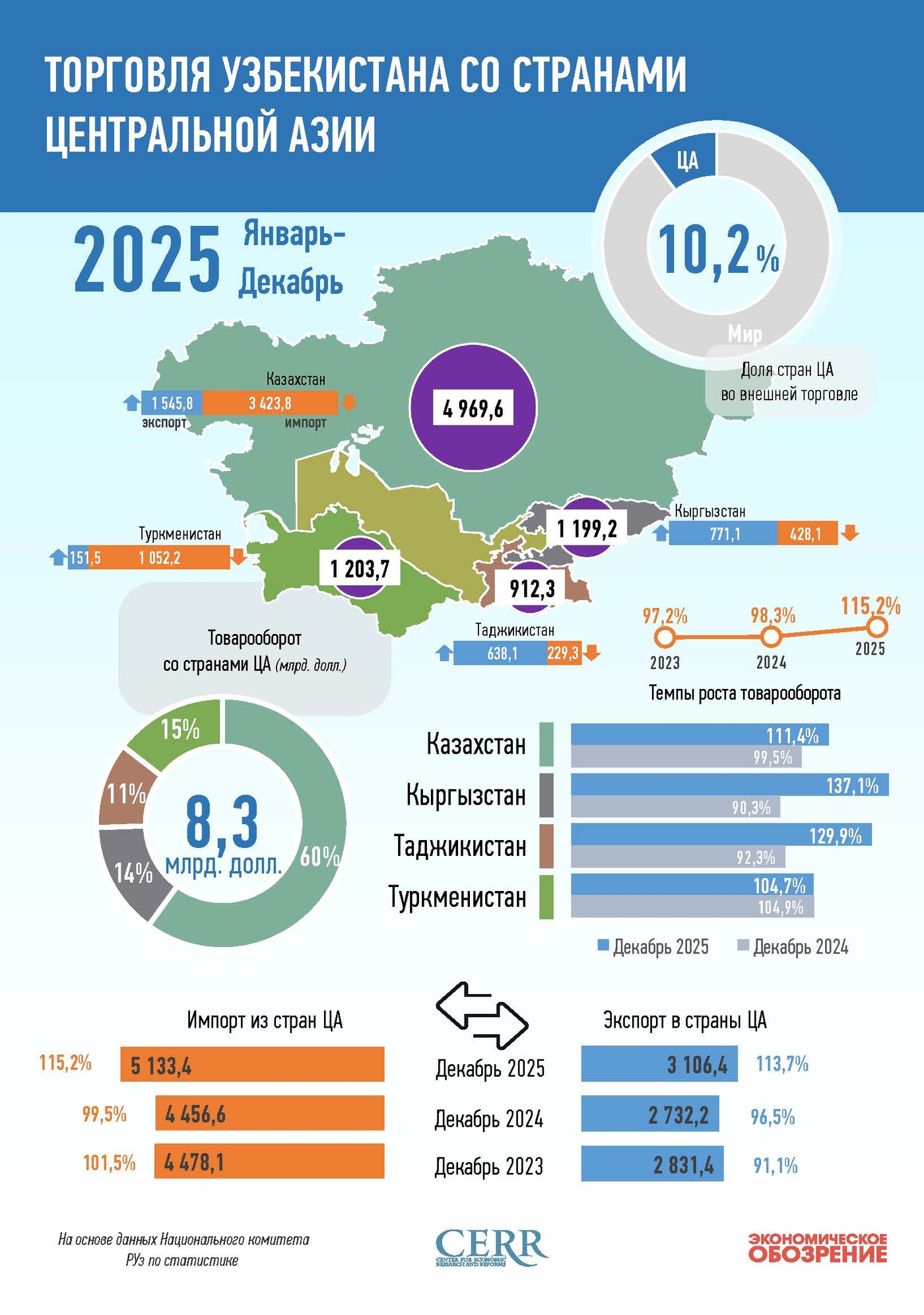 Центр экономических исследований и реформ сообщает об изменениях в объемах товарооборота Узбекистана со странами Центральной Азии за 2025 год. В 2025 году, объем внешней торговли Узбекистана со странами Центральной Азии достиг $8,3 млрд. (+15,2% к 2024 году), что составляет 10,2% в общем объеме внешней торговли. При этом экспорт Узбекистана в страны Центральной Азии составил $3,1 млрд. (+13,7%), а импорт –... ...