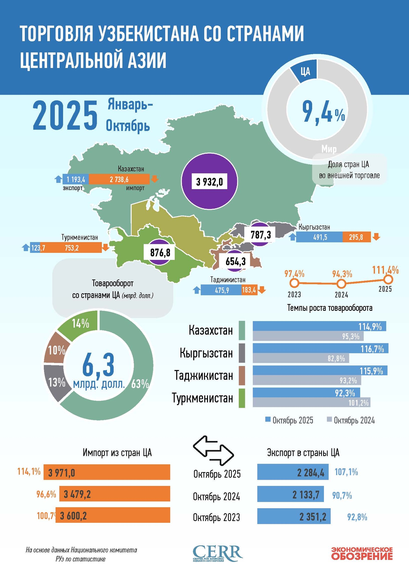 Центр экономических исследований и реформ сообщает об изменениях в объемах товарооборота Узбекистана со странами Центральной Азии за октябрь 2025 года. В октябре 2025 года, объем внешней торговли Узбекистана со странами Центральной Азии достиг $6,3 млрд. (+11,4% к октябрю 2024 года), что составляет 9,4% в общем объеме внешней торговли. При этом экспорт Узбекистана в страны Центральной Азии составил $2,3 млрд. (+7,1%),... ...