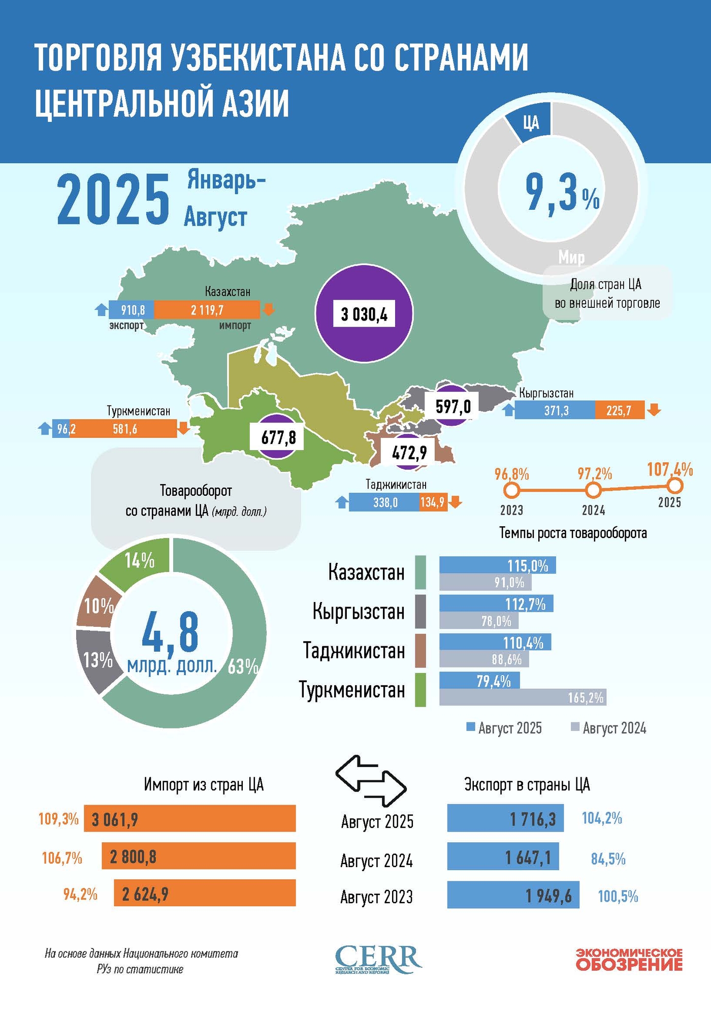 Центр экономических исследований и реформ сообщает об изменениях в объемах товарооборота Узбекистана со странами Центральной Азии за август 2025 года. В августе 2025 года, объем внешней торговли Узбекистана со странами Центральной Азии достиг $4,8 млрд. (+7,4% к августу 2024 года), что составляет 9,3% в общем объеме внешней торговли. При этом экспорт Узбекистана в страны Центральной Азии составил $1,7 млрд. (+4,2%),... ...