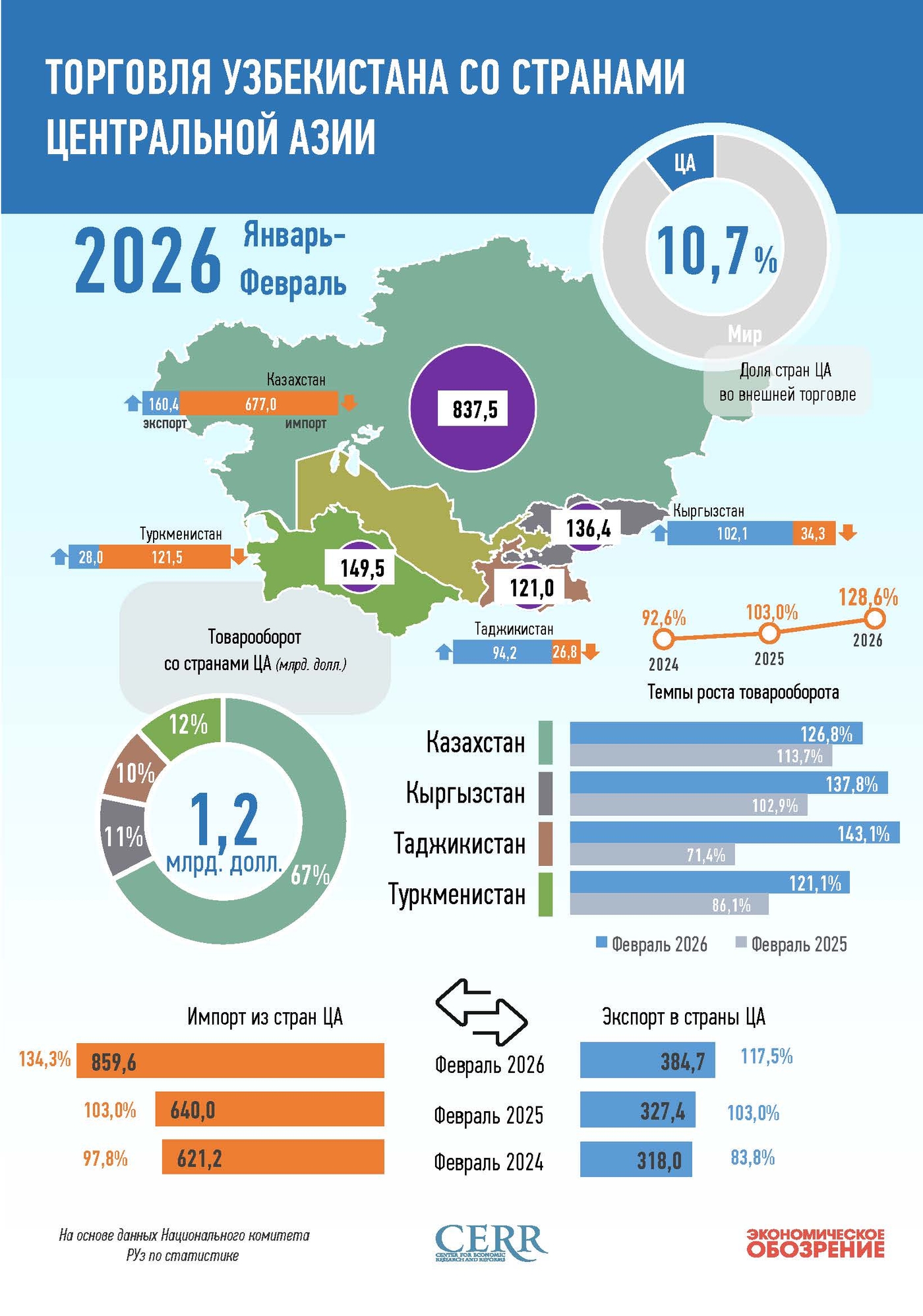 В январе-феврале 2026 года, объем внешней торговли Узбекистана со странами Центральной Азии достиг $1,2 млрд. (+28,6% к аналогичному периоду 2025 года), что составляет 10,7% в общем объеме внешней торговли.