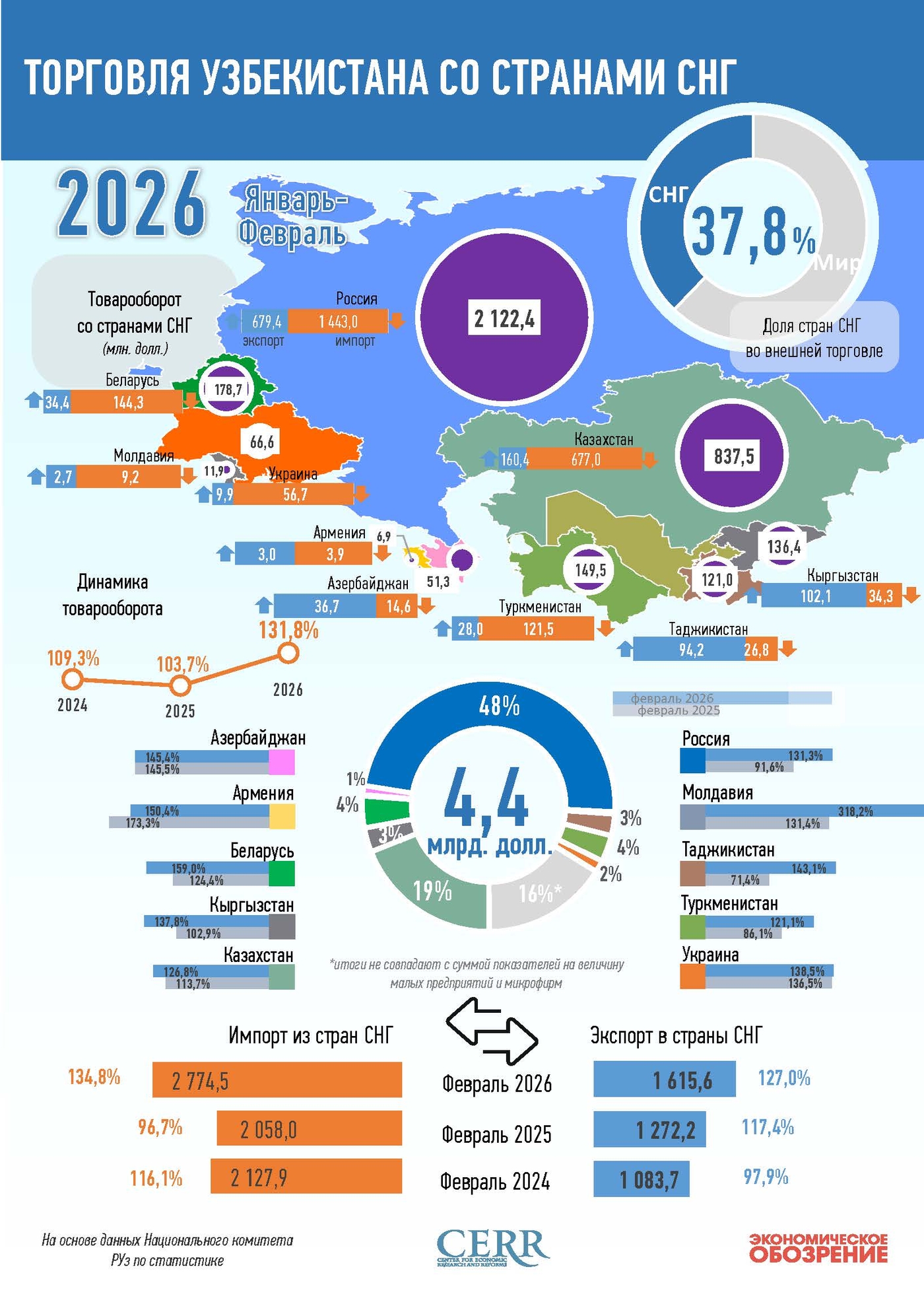 Внешнеторговый оборот Республики Узбекистан со странами СНГ за январь-февраль увеличился на 31,8% и составил $4,4 млрд., из них: экспорт увеличился на 27% и составил $1,6 млрд., а импорт – увеличился на 34,8% до $2,8 млрд.