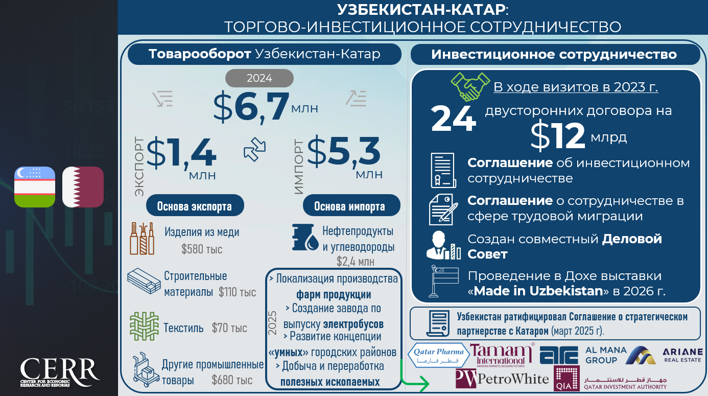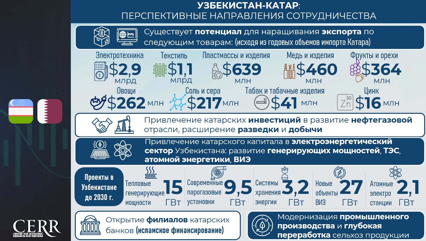 Анализ ЦЭИР показывает, что между Узбекистаном и Катаром существует значительный потенциал для наращивания торговли.