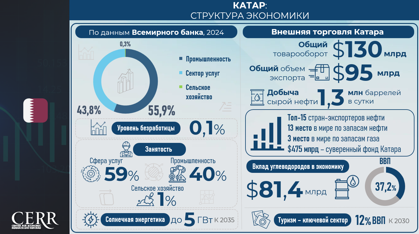 Согласно данным Всемирного банка, в 2024 году наибольшая доля экономики Катара приходится на промышленность (55,9%) и сектор услуг (43,8%), тогда как сельское хозяйство занимает лишь 0,3%. Уровень безработицы составляет 0,1%, при этом 40% занятого населения трудятся в промышленности, 59% – в сфере услуг.