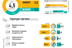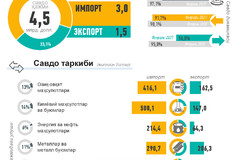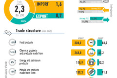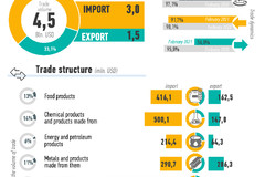 Из общего объема ВТО экспорт составил 1 494,6 млн. долл. США (к январю-февралю 2020 года отмечено снижение на 43,2 %), а импорт – 3 025,1 млн. долл. США (снижение на 8,3 %). В результате сальдо внешнеторгового оборота составило пассивный баланс на сумму 1 530,5 млн. долл. США.