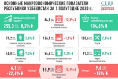 Предварительные данные Госкомстата РУз свидетельствуют о сохранении, пусть и незначительного, роста экономики в первом полугодии 2020 г. Валовый внутренний продукт (ВВП) составил 255,3 трлн. сумов и увеличился на 0,2%, тогда как за аналогичный период прошлого года отмечался 6%-ый рост. Рост валовой добавленной стоимости отраслей составил 0,3%.