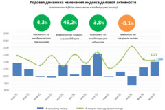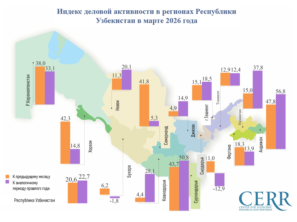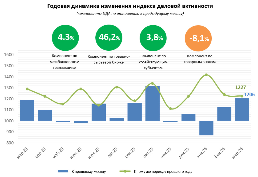 Индекс деловой активности (ИДА), рассчитанный Центром экономических исследований и реформ, в марте 2026 года составил 1206 пунктов, увеличившись на 20,6% по сравнению с предыдущим месяцем (в годовом выражении рост составил 22,7%).
