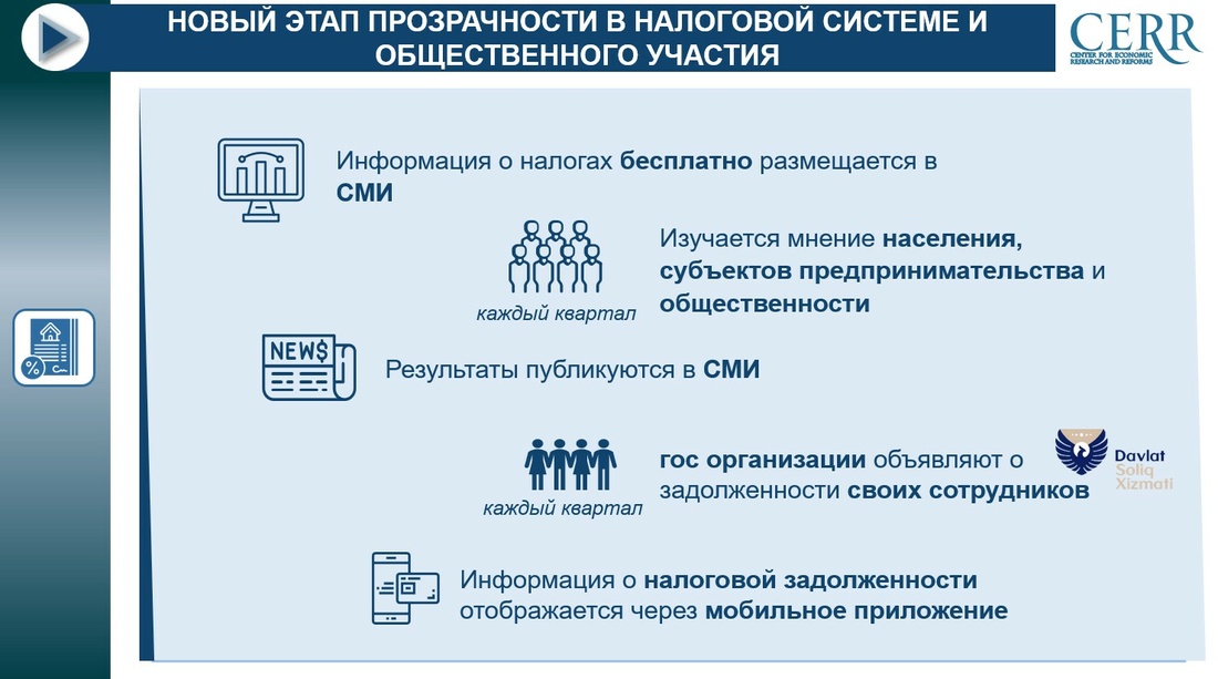 В рамках реализации Постановления Президента Республики Узбекистан «О мерах по повышению собираемости налогов и стимулированию активных налогоплательщиков» в стране внедряется ряд важных нововведений, направленных на укрепление налоговой дисциплины, повышение фискальной культуры среди населения и бизнеса и сокращение доли скрытой экономики.