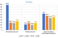 По состоянию на 1 января 2021 года активы коммерческих банков достигли 366,1 трлн, увеличившись на 120% по сравнению с 2017 годом. В этот период среднегодовой реальный рост (без учета девальвации) составил 24,1%.