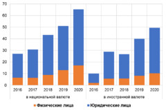 По итогам 2020 года объем активов коммерческих банков составил 366,1 трлн сумов, из которых 277 трлн. сумов пришлось на долю кредитов. При этом номинальный рост активов составил 34,2% по сравнению с 2019 годом, а реальный рост (без учета девальвации) – 28%. Примечательно, что доля активов в иностранной валюте в структуре совокупных активов банков постепенно сокращается. Если в 2017 году этот показатель составлял 64%, то к 2020 году он снизился до 50,2%.