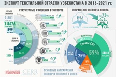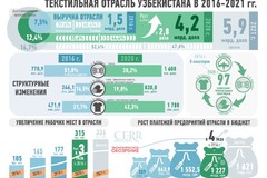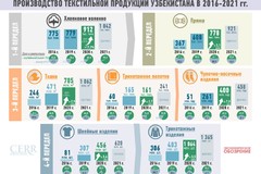 Сегодня отмечается ускоренная динамика наращивания производства текстиля и одежды: за четыре года увеличилось в номинальном выражении в 2,8 раза. В натуральных объемах производство хлопкового волокна выросло на 17 процентов, пряжи - в 2,1 раза, тканей -в 2,9, трикотажного полотна - в 3,2, чулочно-носочных изделий - в 7,1, швейных - в 5,6, трикотажных - в 3,5 раза. Доля текстильной отрасли в общем объеме промышленного производства страны увеличилась с 7,5 процента в 2016 году до 12,4 - в 2020-м, что говорит о ее опережающем развитии относительно других отраслей экономики.