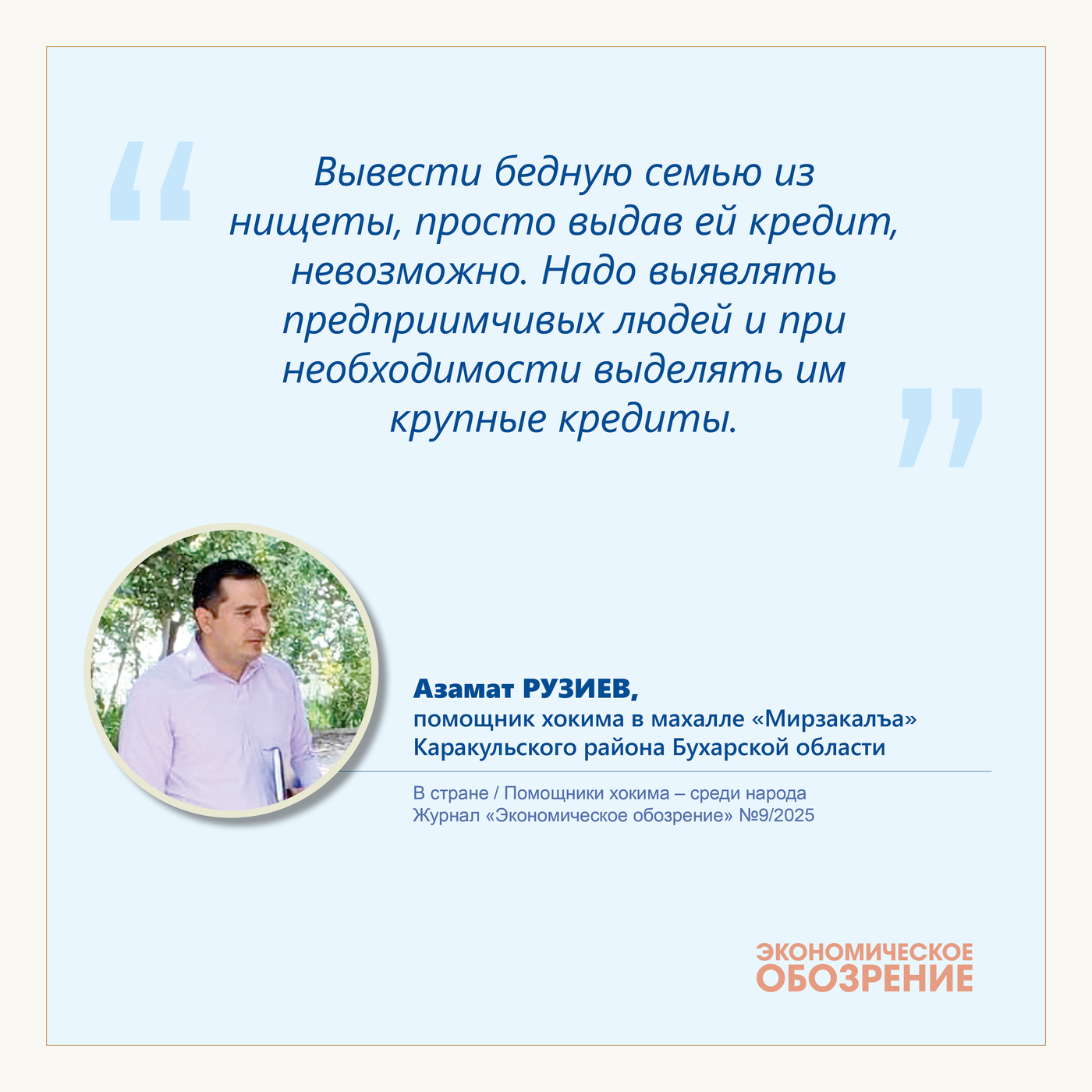 – Когда я начал работу в 2022 году в МСГ «Мирзакалъа» уровень бедности населения составлял почти 40 процентов, а точнее 38,5 процентов. Мы изучали проблемы бедных, среди которых не только удалённость от центра города и отсутствие возможностей для трудоустройства, но и привычку к иждивенчеству, к тому, что государство всегда должно им помогать. За эти годы мы изменили их мировоззрение и мышление, создавая при этом новые рабочие места в махалле. На 1 сентября 2025 года уровень бедности уже снизился до 6,1 процентов. Должен подчеркнуть одно: вывести бедную семью из нищеты, просто выдав ей кредит, невозможно. Надо выявлять предприимчивых людей и при необходимости выделять им крупные кредиты. Это поможет создать новые рабочие места и трудоустроить малоимущих членов семей, тем самым выводя их из бедности.